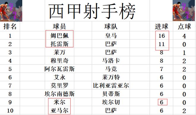 射手榜方面,姆巴佩错失半单刀良机未能继续进球,还是16球位列榜首。托雷斯11球排在第2,莱万,穆里奇8球并列第3。米尔昨晚梅开二度,追上亚马尔,莫里罗,埃尔南德斯等人,将前十的门槛提高到6球。